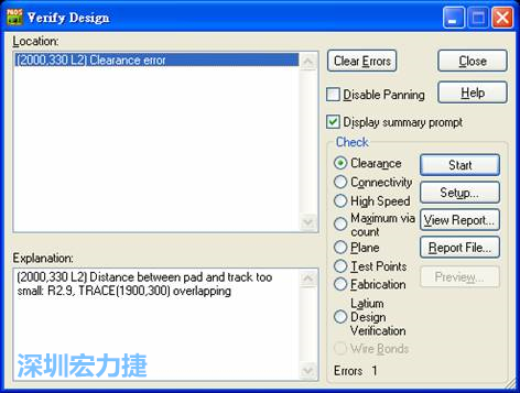要特別注意手工布線的過程中,程序并不檢查是否符合PCB設計布線規則,或是是否全部完成布線,我們必須另外使用「驗證設計 (Verify Design)」功能來檢查是否有錯或已完成,作法如下: