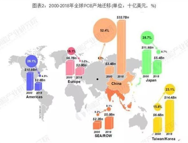 中國(guó)作為全球PCB行業(yè)的最大生產(chǎn)國(guó),占全球PCB行業(yè)總產(chǎn)值的比例已由2000年的8.1%上升至2018年的52.4%,美洲、歐洲和日本的產(chǎn)值占比大幅下滑,中國(guó)大陸和亞洲其他地區(qū)(主要是韓國(guó)、中國(guó)臺(tái)灣和東南亞)等地PCB行業(yè)發(fā)展較快。