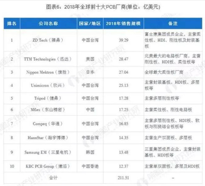 全球印刷電路板行業(yè)集中度不高,生產(chǎn)商眾多,市場(chǎng)競(jìng)爭(zhēng)充分。雖然目前PCB行業(yè)存在向優(yōu)勢(shì)企業(yè)集中的發(fā)展趨勢(shì),但在未來較長(zhǎng)時(shí)期內(nèi)仍將保持較為分散的行業(yè)競(jìng)爭(zhēng)格局。根據(jù)N.T.Information發(fā)布的2018年世界百?gòu)?qiáng)PCB企業(yè)排行榜,2018年前十大PCB廠商收入合計(jì)為211.51億美元。2018年全球前十大PCB廠商的銷售情況如下: