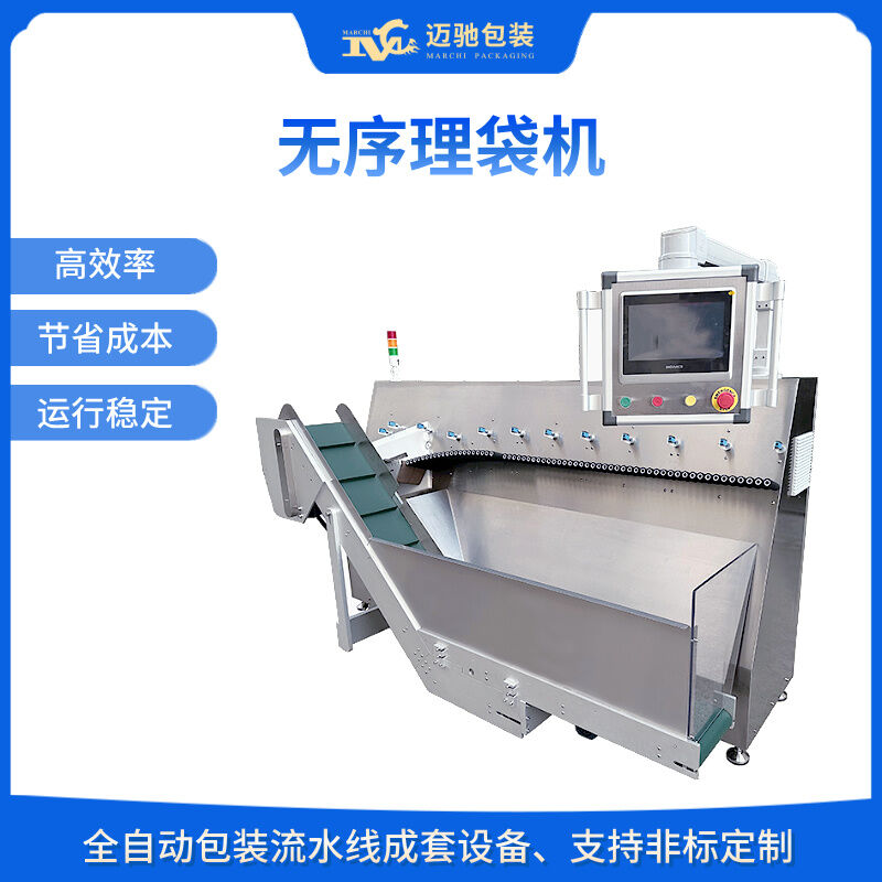 自動理袋機可在生產(chǎn)中單獨使用,也可以與裝盒機對接,完成無規(guī)則的堆積物料從集中到分散再到順序擺放的整個整理過程。無規(guī)則堆積物料倒入儲料倉后,料倉輸送帶動作,將物料輸送至低速滾輪上。設(shè)備通過低、中、高速滾輪的運轉(zhuǎn),將物料逐一順序送出理袋機。送出的物料根據(jù)包裝需要的形式或順序或堆疊進入裝盒機輸送當中完成下一工序的裝盒過程。
